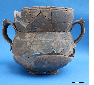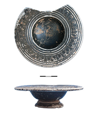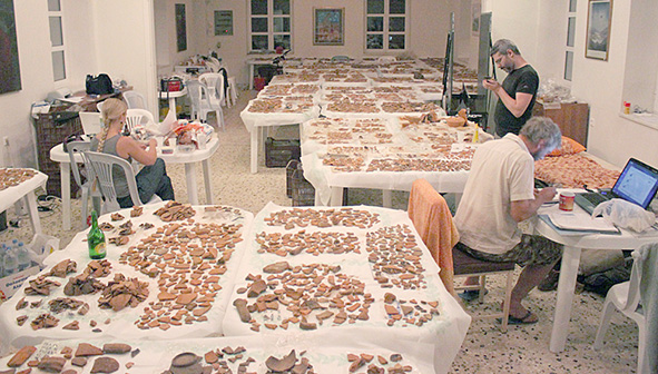 Under the collapsed roof of Room 10 an area of hard burned red clay was found, roughly mid-way between the northern and southern walls of the room. This has probably been a fireplace. Due to lack of time the fireplace was left unexcavated and the work was focused on the ca. 2.5x4.5 m large part of the room located to the east of the fireplace. Close to the eastern wall the foot of a Hellenistic lime-stone perirrhanterion was found, standing up-side-down on top of the floor that consisted of gravel and packed soil. The cultural layer between the collapsed roof and the floor contained e.g. a total of 14 coins, five loom-weights, five lamps and three unguentaria. The coins date, as in Room 9, from the mid-fourth century until 48-35 BC, the lamps in their turn to the third or second century BC..