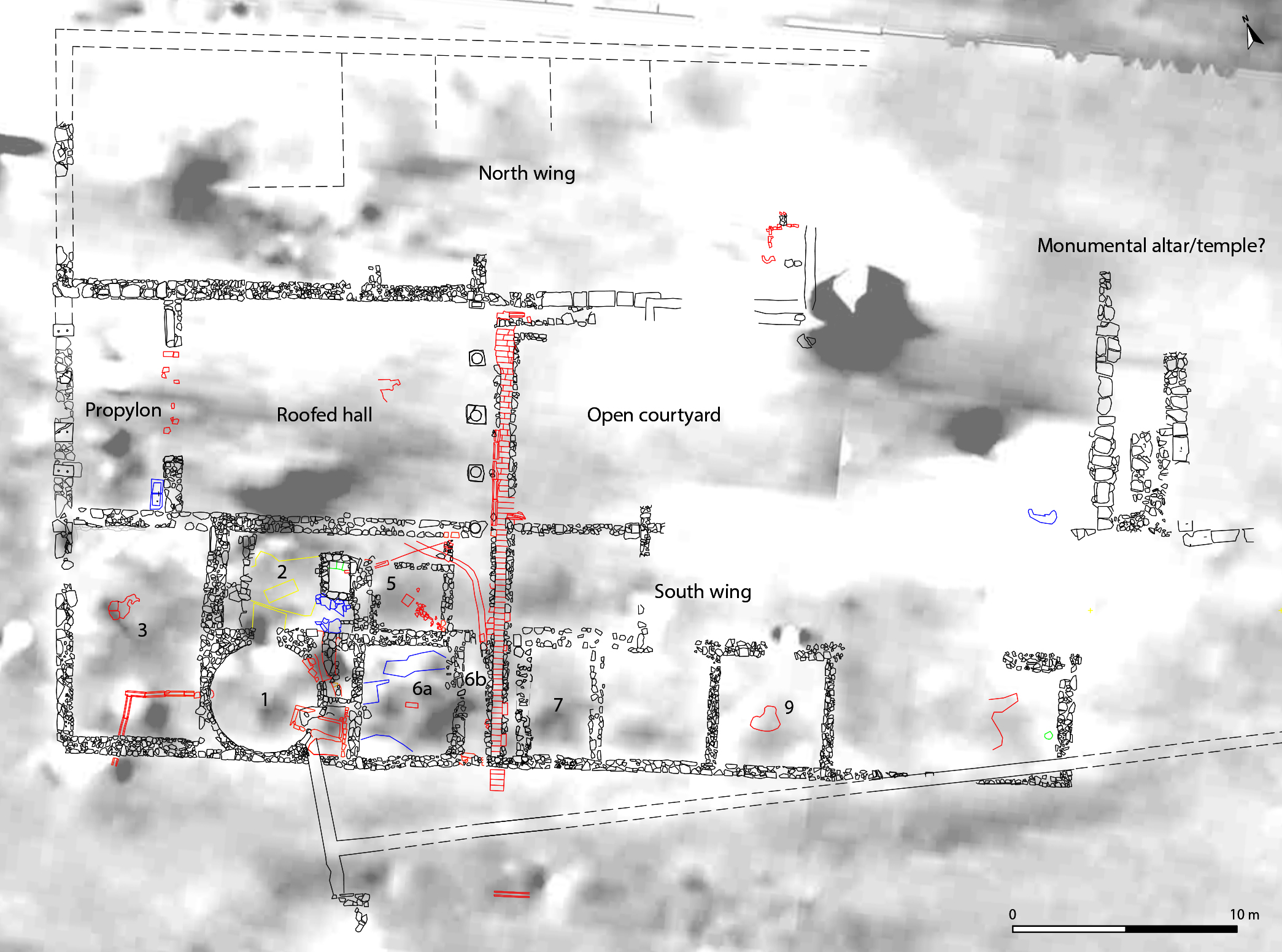 The focus of our work in 2014 was put on the propylon and the hall that led to the courtyard as well as on the still rather enigmatic east end of the early courtyard building, although some work also was put on the south wing. The preliminary results of the work in 2014 are as follows. The entrance to the early courtyard building The 5 m wide main gate to the early courtyard building could on the basis of our work in 2013 be reconstructed as consisting of two single-leaf doors on each side of a wider double-leaf door in the centre. One of our aims with the work of 2014 was to clarify what the propylon looked like and if there were any columns in front of the gate when it was approached from the west. And what about the ca. 13x9.5 m large space or hall that was located between the gate and the inner courtyard? Was it roofed and possibly subdivided into smaller rooms?