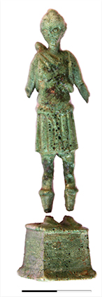 Below the collapsed roof tile layer in the entrance hall and the large hall followed a cultural layer with sparse finds dating mostly between the third and first centuries BC. The floor consisted of stamped soil. The entrance hall produced one remarkable find; a bronze figurine depicting the goddess Artemis in short chiton with a quiver on her back. There is also an Early Hellenistic pottery dump at the east end of the entrance hall below the floor level.
